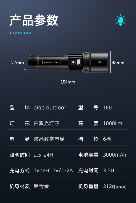 爱国者/Aigo T60 手电筒 强光手电筒超亮激光 单位:只