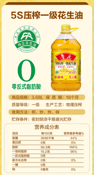 鲁花 YZHS3.68 花生油 物理压榨花生油3.68L 单位:桶