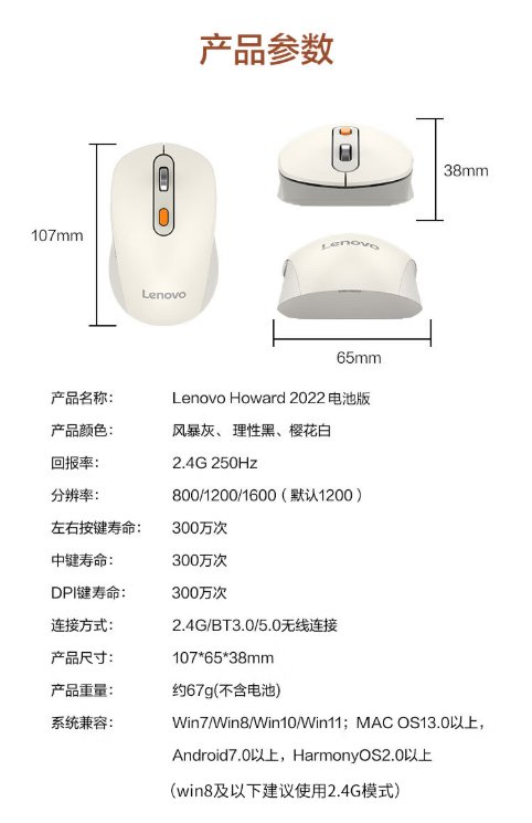 联想/LENOVO Howard 鼠标 无线蓝牙双模鼠标 单位:个