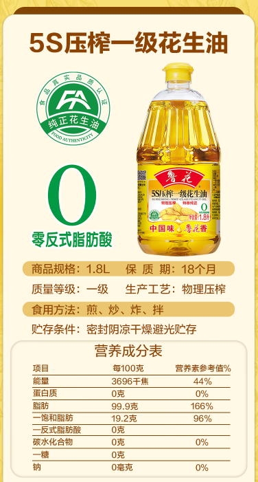 鲁花 YZHS3.6 花生油 物理压榨花生油1.8L*2 单位:桶