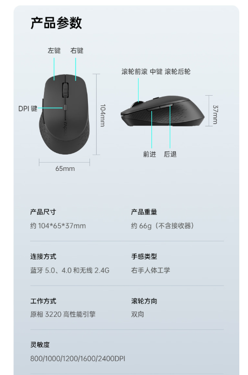 雷柏/RAPOO M300L-B 鼠标 中小手无线 单位:个